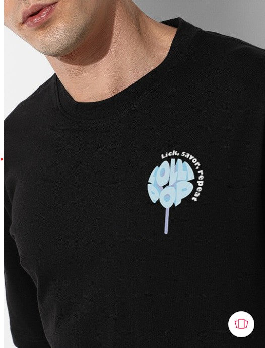 Black back printed t-shirt, has round neck, short sleeves, slip-on closure and regular waist hem
