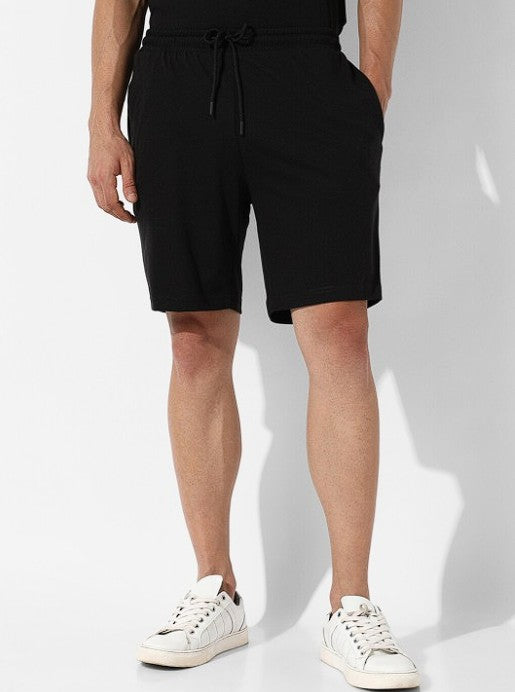 Black solid mid-rise shorts, has drawstring closure and straight hem