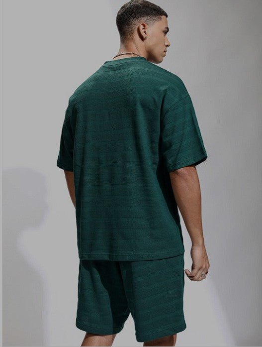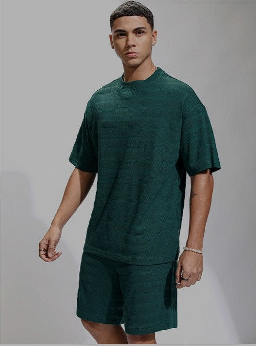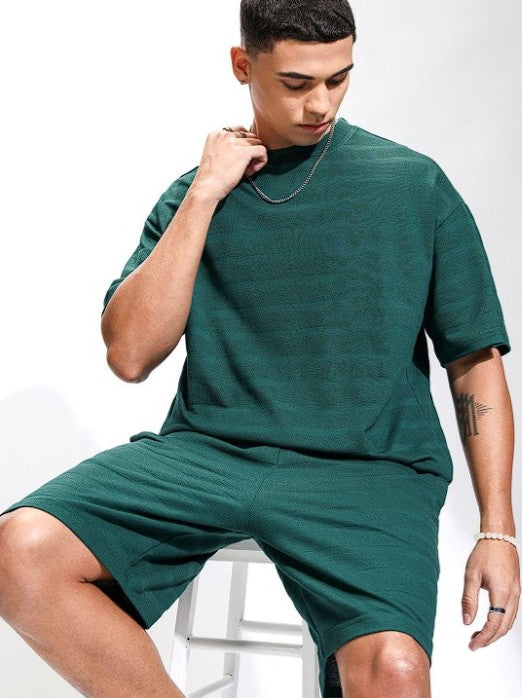 Teal self design t-shirt, has round neck short sleeves